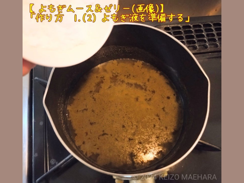 よもぎ液を50~60℃程度に冷ましから、ふやかしたゼラチンを加えてよく混ぜ、ゼリー液を冷ます