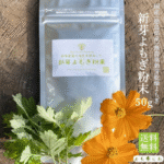 ブログで紹介した「新芽よもぎ粉末」はよもじおオンラインショップでお求めいただけます